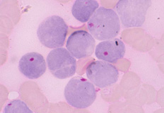 本例は、形態学的所見にPAS染色の点状陽性が急性リンパ性白血病(ALL)を強く支持するものになります。しかし、PAS陰性例や芽球の起源を掴むには、リンパ系のマーカー(CD19、10、79aなど)を証明します。小児ALLでは、発症年齢が4〜7歳、白血球正常、L1タイプ(FAB分類)、PAS陽性例、CD10陽性例は予後良好群とされるようです。
