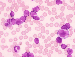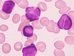 末梢血では小型〜中型(10〜16μm)で、N/C比が高いリンパ球が60%みられ、なかには核形