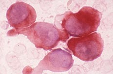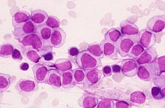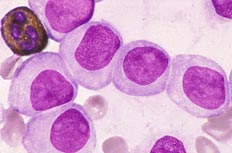 | [骨髄×1000.MG染色] 芽球様細胞(98%)は類円形核でクロマチンは繊細網状で著明な核小体がみられる. |