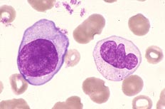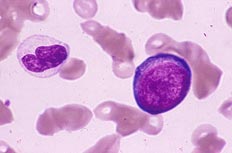 | [末梢血×1000.MG染色] 核は偏在性で著明な核小体を有する細胞が散見される. |