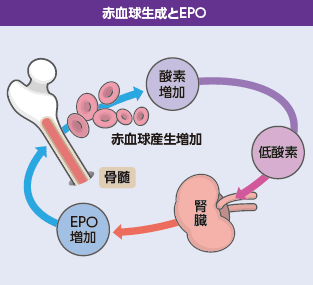 赤血球の産生に必須の造血因子であるエリスロポエチン(EPO)は、腎臓で産生、分泌されています。そのため、腎性貧血や赤血球増加症の鑑別などに用いられます。