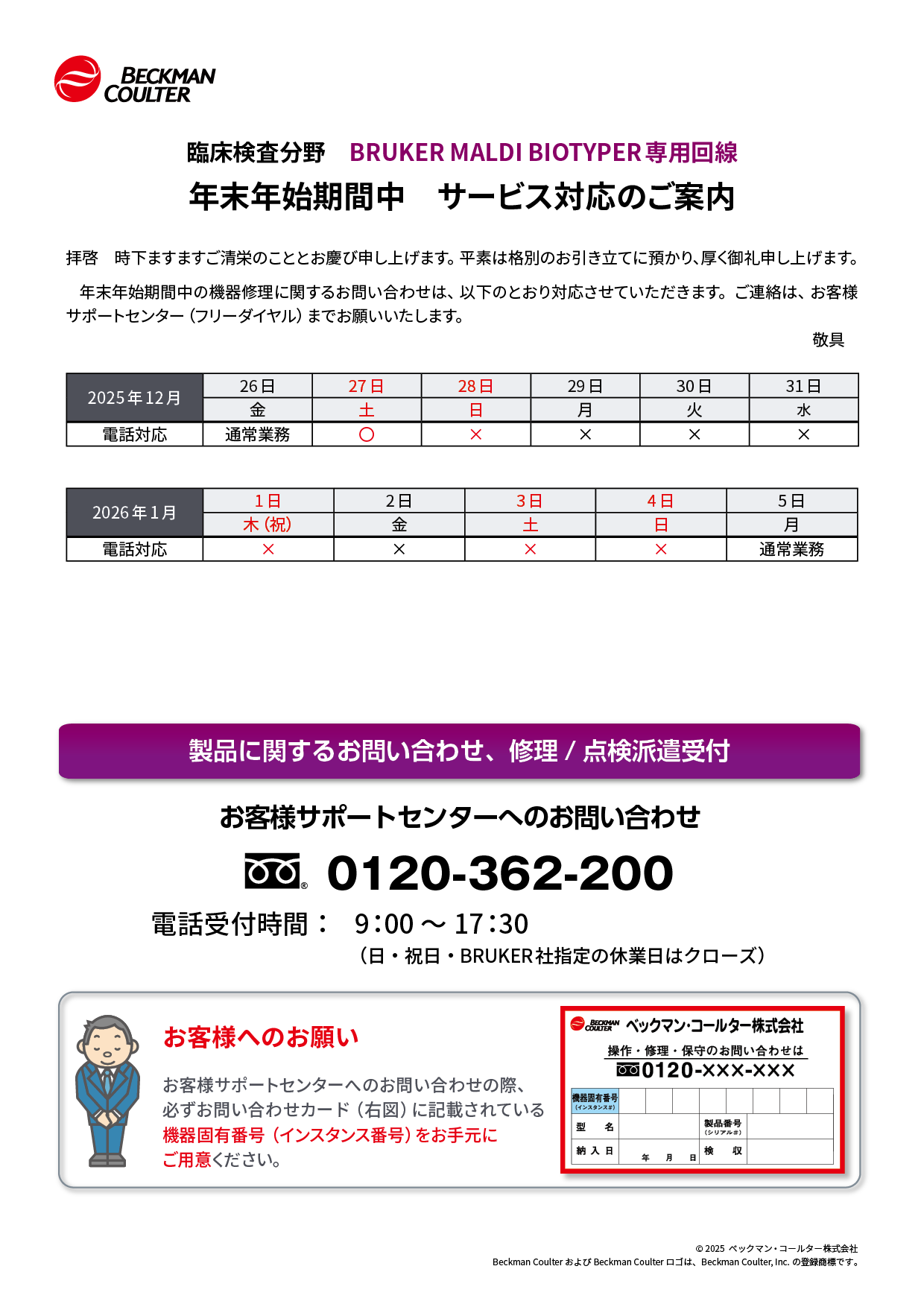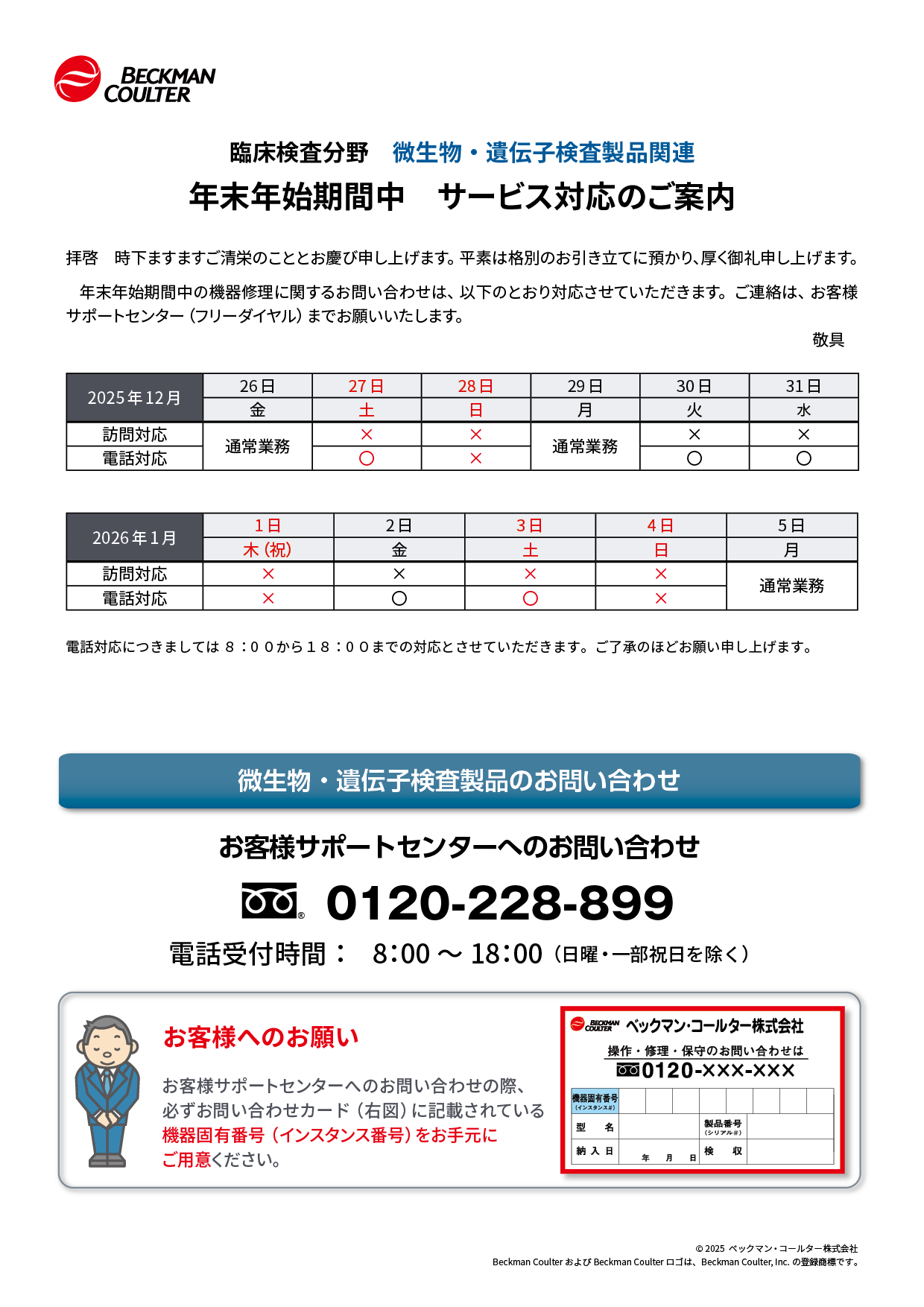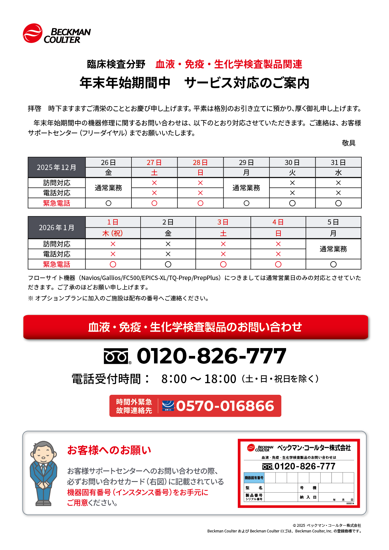 臨床検査分野 年末年始期間中 サービス対応のご案内