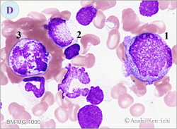 D-3. 核は分裂像を思わせ、細胞質は軽度の好塩基性で顆粒を有し大型であることから前骨髄球の有糸分裂(白分核)と思われます。