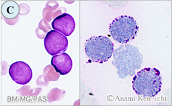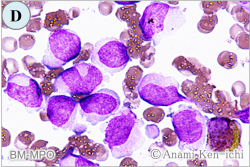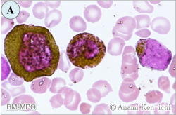 | 【Q2】 | AMLのMPO染色で芽球の弱陽性の判定に迷っています。一個の芽球につきどのくらい染まっていれば陽性ととるのでしょうか。 また、MDSの際に出現するMPO陰性好中球は何個中何個あれば異形成ととるなど具体的な評価指標はあるのでしょうか。 |