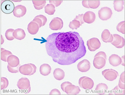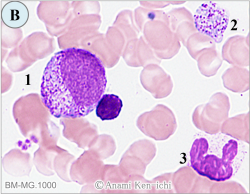 | 【助言1】 | ヒトパルボウイルスB19の感染により、本ウイルスは赤芽球系前駆細胞に選択的感染し、成熟の障害や破壊をもたらすことから、骨髄中の赤芽球は消失し、残存する前赤芽球には親和性を示すことで巨大化となり巨大前赤芽球の形態を呈することが特徴です。 本ウイルスの感染は急性赤芽球癆とされ、胸腺腫などが原因で起こる慢性赤芽球癆がありますが、こちらは骨髄の赤芽球の消失はみられても巨大前赤芽球が出現することはありません。双方と赤血球系のみの異常で貧血が起こりますが一過性とされます。 |
