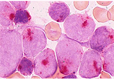 核がほぼ円形のためリンパ球に類似した細胞です。核の形状とクロマチンの結節状そして細胞質の好酸性の色調から好中球を考え、核の形態異常として偽ペルゲル核異常に同定しました。