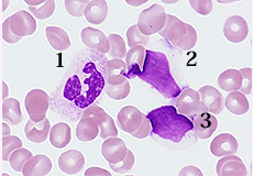 1.単球は大リンパ球(12~16μm)に比べ大型(13~21μm)で、核形不整がみられクロマチン網工は繊細で、細胞質に微細なアズール顆粒が充満してみえます。 2.14μm大の好塩基球で、紫赤色の粗大顆粒は水溶性の性質から染色の工程で抜けることが多く、残存する顆粒は核の上にも散見されることが特徴です。