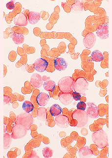 芽球の割合と形態像から骨髄増殖性腫瘍を疑い、なかでも慢性骨髄性白血病(CML)を疑います。ただ、NAP活性が高いことがそれに合致しません。検査にCRPが高値(18.2mg/dL)を示していることより重症な炎症性反応などが伺えます。臨床的に重症肺炎に罹患していることが判明したため、肺炎完治後再度NAP染色を実施したところ活性の低下がみられました。骨髄でも末梢血と同様な像を呈しており、結局、染色体で9;22の転座、BCR-ABL1遺伝子変異が証明されたことによりCMLの慢性期として診断されました。