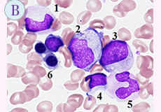 (Case B) 1.後骨髄球、2.前骨髄球、3.前骨髄球、4.リンパ球、5.桿状核球、6.多染性赤芽球