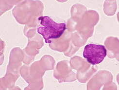 末梢血では小型〜中型(10〜16μm)で、N/C比が高いリンパ球が60%みられ、なかには核形