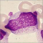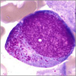 | 骨髄芽球 myeloblast 円形核、核網繊細 核小体明瞭、顆粒なし. |