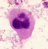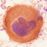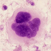 巨核球は未熟の段階で核分裂やDNA合成を生じ、細胞質の分裂を伴わない、いわゆる内分裂(endomitosis)の様式とります。正常型は倍数体の核(2N,4N,8N,16N,32N‥)を有し、大型で分葉核を示します。