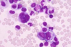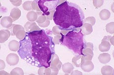 | [骨髄×1000.MG染色] 大型細胞の一部は 好塩基性の細胞質に顕著な空胞を認める. |