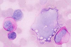 [骨髄×400.MG染色] 核形不整や細胞質に空胞をもつ大型細胞がみられる. |